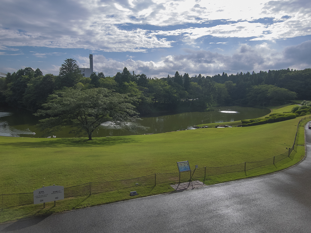 坂道を下り終えると池が広がっています。