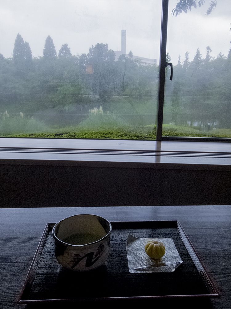 前面がガラス張りの茶席。この日は生憎のくもり空でしたが、景色も一望できます。