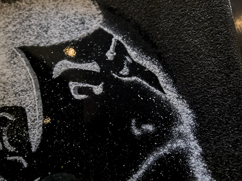 この白い絵の部分(パウダーシュガー)は、おそらく型紙があるのだと思いますが、